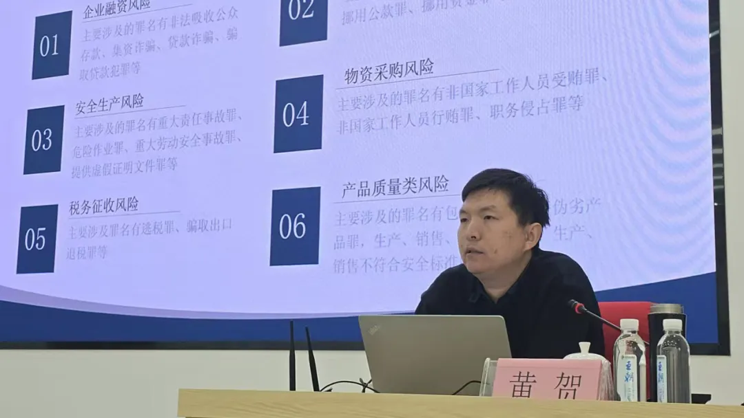 本次培訓(xùn)邀請?zhí)旖蚴袡z察院第二分院第一檢察部四級高級檢察官黃賀同志進(jìn)行專題授課。他從特定領(lǐng)域刑事案件近年總體趨勢和刑事法律風(fēng)險(xiǎn)概述切入主題,通過典型案例深挖刑事犯罪誘因,從立法思路、辦案程序、刑事法律責(zé)任等角度,全方位對刑事犯罪高發(fā)類案做了專業(yè)解讀。